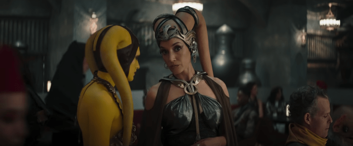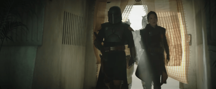 Boba and Fennec enter into an unknown building, pushing aside a curtain to enter. And this is probably as good of a time as any to mention that, throughout the trailer, we see that Boba is escorted by two Gamorrean Guards. So he’s keeping Jabba’s security in place, and after seeing two Gamorreans fighting in the premiere of The Mandalorian season two, I’m excited to see them return.