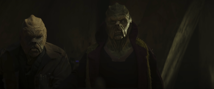 At Boba’s dinner, one of the Trandoshans arrogantly asks, “What prevents us all from killing you, and taking what we want?” At this, Fennec exchanges a glance at Boba, who calmly takes a drink from his cup. Once again I’ll say that the aliens in this show look really good, and that these Trandoshans look great. Beyond being visually impressive, though, this does give us the impression that these captains aren’t exactly totally on board with Fett’s proposal. I wonder if a significant part of this show, at least at first, will see Fett trying to establish a cooperative partnership with others, even if the relationship is a bit strenuous.