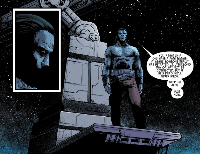 But now let’s jump over to the Nihil, and I loved seeing Marchion Ro in this issue, and seeing him without his armor. In fact, we get a shot of him standing atop his ship, apparently in space, which is pretty epic. Uttersond has something he wants, and Ro orders the Dr. to bring it to him – but Ro doesn’t trust Uttersond. The implication is that Ro suspects Uttersond is a traitor but doesn’t know for sure, and I suppose that’s the same place we are in – although this issue and the previous one does seem to make it pretty clear that he’s working with the Tarnab on some plan of sorts. We just don’t know what that is.