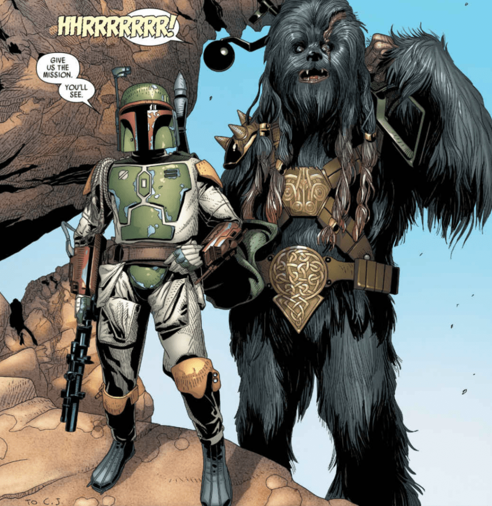 Black Krrsantan was created by Kieron Gillen for the first issue of his Darth Vader comic series (which began in 2015). In the series (set in-between A New Hope and The Empire Strikes Back), Darth Vader visits Jabba the Hutt and demands his help in some missions. Jabba enlists his two best bounty hunters for Vader: Boba Fett and Black Krrsantan – meaning this show is not the first time the two have met, and they are surely quite aware of the other.
