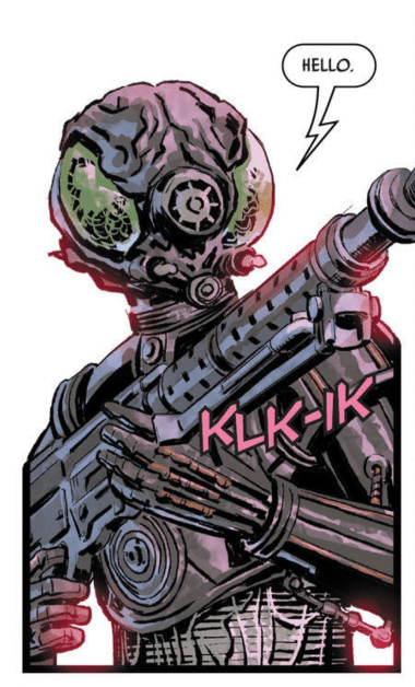 That’s obviously not saying much, since he appeared in an extremely minor way in The Empire Strikes Back, such that most people surely didn’t even notice him. 4-LOM is one of the bounty hunters called by Darth Vader to his Star Destroyer to hunt down the Millennium Falcon. 4-LOM was a protocol droid turned bounty hunter, which makes for a pretty interesting character in its own right, and he frequently worked with Zuckuss, another bounty hunter seen in Empire. By Star Wars standards he’s actually appeared in comparatively little canon content, but he’s shown up more recently in the Bounty Hunters comic and the War of the Bounty Hunters crossover storyline.