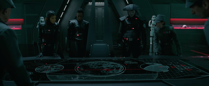 In the Fortress Inquisitorious, Reva arrives in the hangar, and then we see the Fourth Sister, Reva, and the Fifth Brother in a room looking at readouts. You can also see in the background that it looks like certain artifacts are on display, which is cool. I loved the design of this Fortress when it appeared in Jedi: Fallen Order, and I’m thrilled that we’re seeing it in live-action.