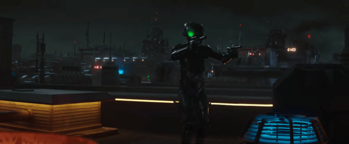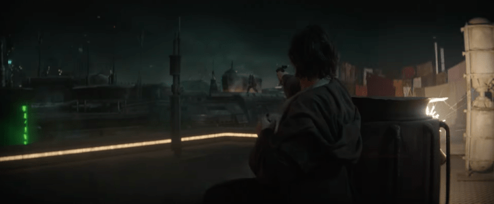 Not only does the Empire send out probes in search of Obi-Wan, but they also enlist bounty hunters in the quest. We see the blaster fight from the Daiyu rooftops that we glimpsed in the first trailer, but this time with more context: we see Reva watching it from afar, and that means she’s probably now alerted to Kenobi’s whereabouts. In response to the person saying Kenobi is gone, Reva says, “Maybe you’ve been looking in the wrong places.” We then hear her saying, “I want every low-life and bounty hunter to squeeze him.” We get a montage of Kenobi firing back at bounty hunters on the rooftops, and then him confronted by some thugs in an alleyway.