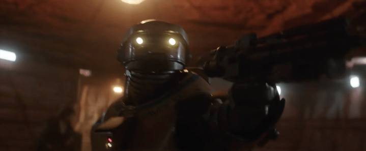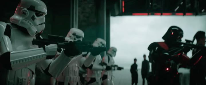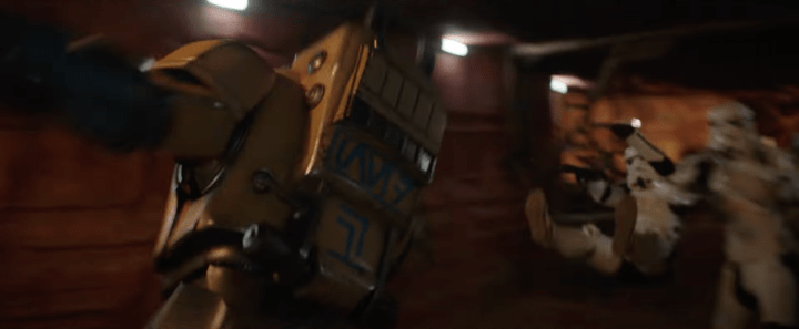 We saw a brief glimpse of this droid in the first trailer, but now we get a much better look at it holding off some stormtroopers – while, if you look carefully, it seems Kenobi is in the background sneaking around. So this might be a facility of sorts that he’s trying to infiltrate, and this droid is helping him do so.