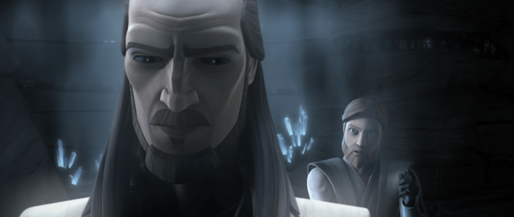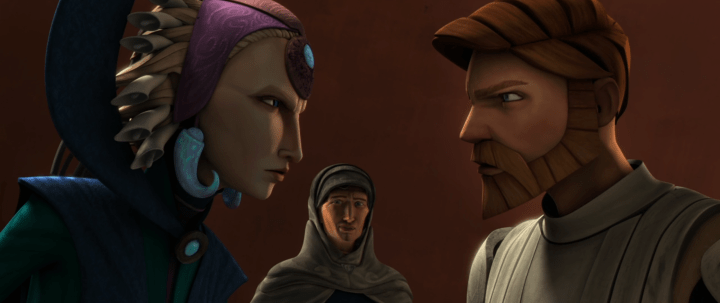 In this trio of episodes – “The Mandalore Plot,” “Voyage of Temptation,” and “Duchess of Mandalore” – Obi-Wan undertakes a tricky assignment: protecting Duchess Satine Kryze, the ruler of Mandalore who has pledged neutrality in the war, against threats from the Mandalorian terrorist group Death Watch. Why is that so tricky? Because Obi-Wan and Satine have a complicated – and romantic – history. This arc opens up a brand new side of Kenobi, allowing us to see how he navigates the realm when the woman he loved, the woman he would have left the Jedi Order for, becomes a part of his life once more.
