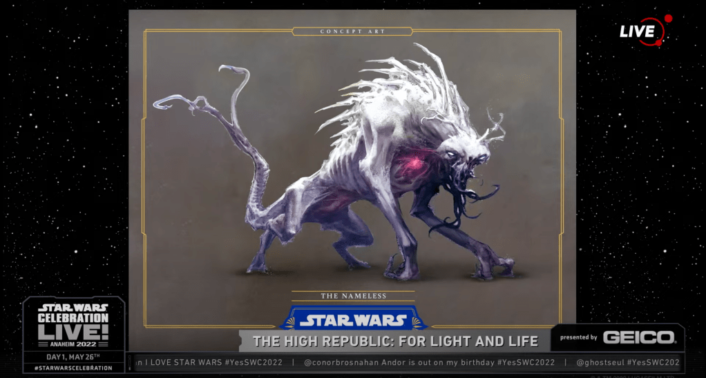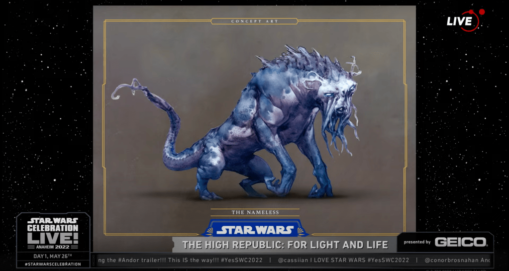 The last reveal in the whole panel was from Michael Siglain, who showed fans concept artwork of the Nameless and the Great Leveler! They posed one of the most dangerous threats to the Jedi in all of phase one, able to sever one’s connection to the Force, strike fear into Jedi, and kill them. Part of their danger was the mystery behind them, such that at the very end of phase one we see the Grand Masters of the Jedi Order recalling all Jedi across the galaxy back to Coruscant due to the unknown threat. And while we slowly began learning more and more about them as the stories went on, we’ve never actually seen them – until now! And I mean, looking at them, it’s clear you don’t want to encounter one!