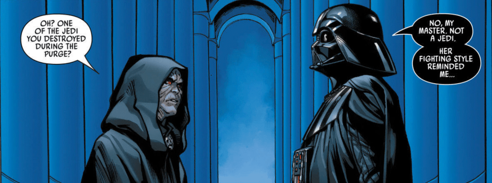 The highlight of this issue was the conversation between Palpatine and Vader where they figure out Maul’s influence. Vader talks about his fight against Qi’ra, noting that she was trained in more than just Teras Kasi but actually techniques he’d also observed in Palpatine himself. The Emperor says he didn’t train her, but maybe someone he trained was the one who trained her. He opines that if they had found her in a royal court it would probably have been Tyranus, but since she “wallows in the mud of the criminal syndicates” it must have been Maul instead. It shows how each of them were viewed by Palpatine, with Dooku the more noble and respected one and Maul the one more suited for the underworld. There’s a nobility in Dooku and a savagery in Maul.