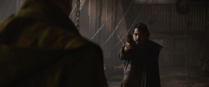 Luthen tells Cassian that he actually wants him, not the box, and reveals that he knows what happened to Cassian’s father: they took him and hung him in the town square. Cassian draws his blaster and demands to know how Luthen knows it, and Luthen offers him the chance to “fight these bastards for real.” The clip then jumps to another moment, where the police storm the building and Cassian and Luthen fight and escape.