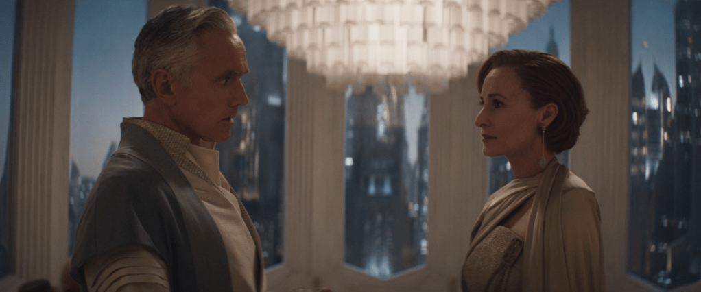 Mon Mothma pays a surprise visit to Luthen Rael, where she is stunned and speechless about his role in the attack. Luthen tells Mon that there’s no use to a weapon if they don’t use it, and he needed to get the Empire to over-react and impose strict sanctions. Mothma realizes this means people will suffer, and Luthen acknowledges that’s his plan. Mothma leaves, and later hosts a dinner party where she has a long discussion with an old friend, Tay Kolma, who runs a banking organization on Chandrila. Mothma lets him in on what she’s really doing, asking for his help to access her family funds.