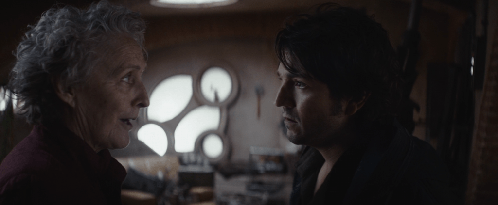 All of this leads into a scene that, if not for the dinner party, would be my favorite in the entire series to-date as well: Cassian’s conversation with Maarva. Fiona Shaw is superb, and it’s hard not to get emotional while she’s talking with her adopted son. She tells Cassian that he must go, but that she cannot. And when Cassian responds that he won’t be able to stop worrying about her, she tearfully responds, “that’s just love.” It’s fantastic. But it also highlights something else: Bix tells Cassian that people blame him for the Empire’s overreach on Ferrix, but Maarva tells him that the actions on Aldhani have inspired many. Cassian doesn’t view himself as a hero, but others do, for standing up to the Empire. It has inspired Maarva to do the same. The rebellion is spreading.