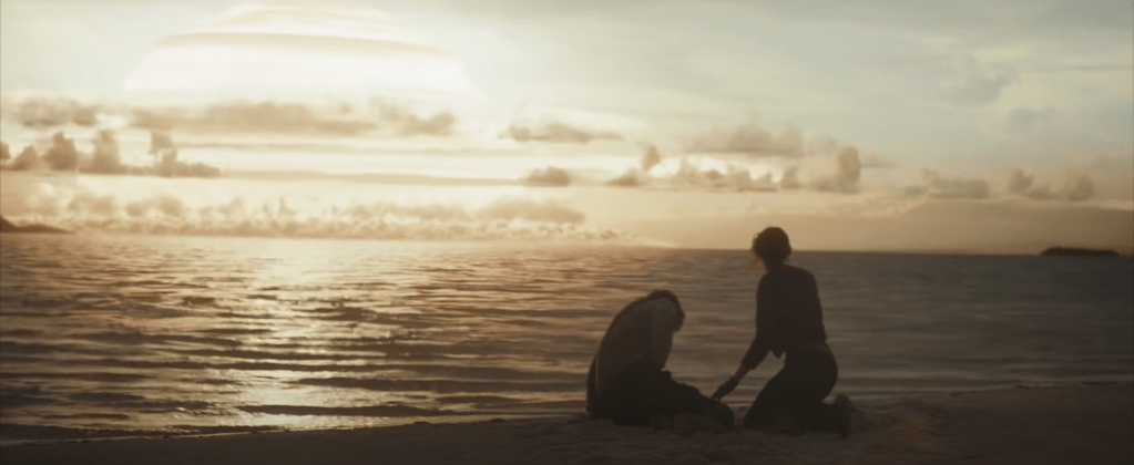 But there’s yet another example that showed up in the most recent episode, “Daughter of Ferrix.” The episode ends with Cassian learning about the death of his mother, Maarva. He contacts Ferrix with a message for his mother: “Tell Maarva I’m ok. Tell her I’m thinking about her. She’d be proud of me. And I’ll get back as soon as I can.” But he then learns that Maarva is dead. We then see that he’s calling from the beach on Niamos, and as he and Melshi part ways at the end of the episode, Cassian is left alone staring out over the sea, as the sun rises.