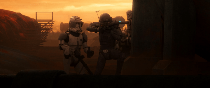 Because make no mistake: this felt so much like an episode of The Clone Wars. It starts with a mission being assigned, then a clone squadron heading to this Separatist-controlled planet to fight against a droid army to try to complete the objective. We even hear Kevin Kiner’s clone theme from the other series show up throughout, and as viewers we’re right back in the thrall of the beloved series, rooting for the clones to win against the bad guys.