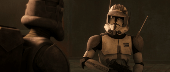 It’s the culmination of so many things rumbling in Cody’s heart and mind, and he expresses them to Crosshair. But Crosshair simply muses that they follow orders. Cody’s response to him is that, if true, that makes him no different than the droids. Earlier in the episode Crosshair’s disgust with the droids was apparent, saying that the weakness of the Separatist tanks are the droids that operate them. He thinks very little of them and their abilities, so it’s a stinging rebuke when Cody implies that he’s acting just like them. But Cody is on to something profound, and it’s that the thing that separates the clone army from the droid army is that the clones have a sense of morality, an ability to make their own choices, an opportunity to freely act. If they simply follow whatever orders they’re given, without thinking and without processing, they might as well be droids. I’d bet that by this point Cody doesn’t know about the inhibitor chips or anything like that, but he isn’t sold on how some clones offer blind loyalty to a government that, he’s increasingly seeing, doesn’t deserve it.