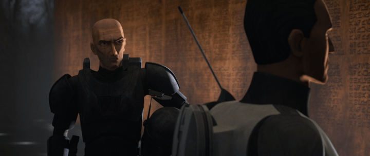 An Imperial convoy arrives on Desix to establish a new governor under Imperial rule, but they are met by resistance from Separatist droids, as the planet’s current governor, Tawni Ames, refuses it and takes the new “governor” captive. This leads Admiral Rampart, back on Coruscant, to send a squad to the planet, and he recruits Crosshair as part of the team – his first mission since being left for dead on Kamino for 32 rotations. But Crosshair is not the squad leader; Commander Cody is. The two share a brief reunion, in which Cody expresses some faint skepticism about whether the Jedi and clones who denied Order 66 were truly traitors. But, with a half-smile, he tells Crosshair, “good soldiers follow orders.”