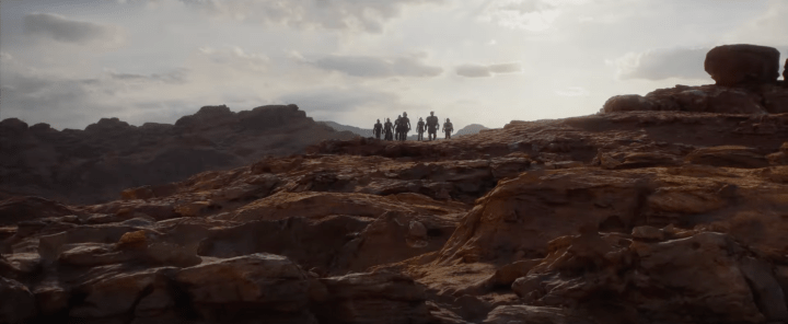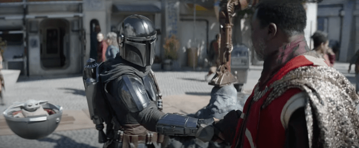 The trailer opens with several shots of Mandalorians. The first is a group walking on a desert planet, and then we see them up-close (seemingly on the same planet), with Din Djarin walking amidst them. As we see this, we hear a voiceover from Djarin saying, “Our people are scattered like stars in the galaxy. What are we? What do we stand for?” Right from the start, then, the trailer seems to be hinting at something hugely important that could be at the center of the whole season: an attempt to reunite the shattered and scattered Mandalorian clans. By my count we’ve already seen at least three different Mandalorian clans that are going to be included, and there is one figure at the center of all of it: Djarin, who just so happens to be wielding the darksaber, the symbol that can unite Mandalore once more under the one who possesses it. I could see that being a significant end-goal for this series, showing how this fledgling foundling comes to be the one to reunite the Mandalorian people and reclaim their home.
