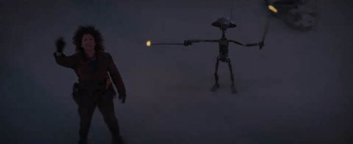 And as the Mandalorians fight the thugs, we see two Anzellans looking on! It’s unclear whether one of them is Babu Frik or whether these are just two new members of his species, but either way they’re sure to be a hit, just like Babu was in The Rise of Skywalker.