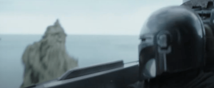 I wasn’t kidding about the N1 starfighter being featured in this trailer. Mando pilots it into a cloudy storm, not really able to see where he’s going (so we don’t learn much), but you can tell that there’s a droid in the slot behind the cockpit. Later in the trailer we’ll see that it’s the R4 unit from Peli Motto’s shop, but presumably the astromech being part of the mission is why Grogu rides on Djarin’s lap in the cockpit.