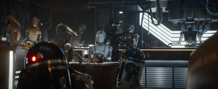 There’s a droid bar, and Mando needs help from the bartender on something, but let’s not miss the real takeaway here: there are B1 battle droids at this droid bar, socializing it up. And that’s simply awesome.