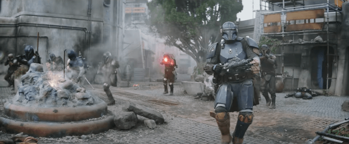 On Nevarro, Djarin’s clan of Mandalorians arrives and fights against some thugs. Remember that this is their old stomping grounds, so it makes sense for them to come back for some reason. Also of note (perhaps) is that the statue of IG-11 that stands in the city square has been removed, for whatever reason…