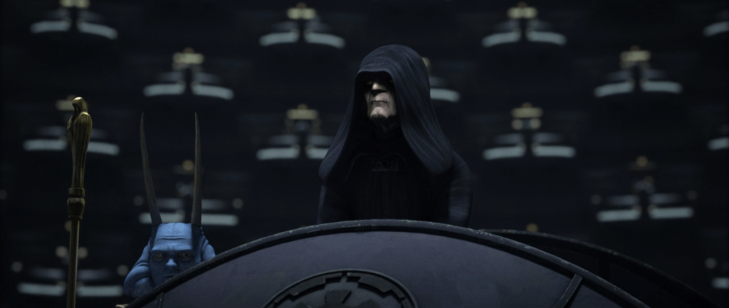 But as in the Clone War, the clones are still just pawns in Palpatine’s plans, and Rampart comes to learn too late that he is too. Rampart views the clones as dispensable without realizing that Palpatine views him the same way. The entire Empire is built on one person, and it is only him who is truly irreplaceable, and that’s the Emperor. I was a bit surprised to see Rampart removed from the board at this point in the show, but at the same time, I think it makes sense and is a brilliant development. As he’s being arrested Rampart protests that he was just following orders, and the irony is that he still had full agency in following those orders, unlike the clones. He doesn’t trust the clones because he sees how not all of them are blindly loyal, but he missed the fact that his blind loyalty to the Empire was misplaced. It’s a truly satisfying bit of justice seeing his lies and treacheries exposed, but at the same time it’s a reminder of who it is that’s the true mastermind behind it all: it’s Palpatine. Everything about his appearance here was perfect, and Ian McDiarmid once again was flat out fantastic. To see Palpatine come along and feign appreciation for Chuchi and anger at Rampart, while at the same moment twisting that very reveal to get the bill passed, was so true to character. As Rex notes later, Palpatine was always a few steps ahead of them during the Clone War, and he still is. This is a brilliant political mastermind, one who is able to play both sides so perfectly that he gets his way without people feeling like it’s being forced upon them. I can’t say enough about how good of a move it was for this series to show Palpatine using the actions that our heroes worked the whole time for to actually accomplish the opposite of what they intended. In doing so, they actually unwittingly served his very purposes.