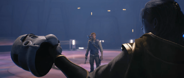 The first trailer for the game showed a mysterious figure in a bacta tank, and the second trailer showed that same figure in some golden robes that looked strangely similar to the robes the Jedi wore during the High Republic era. This trailer seemingly confirmed that the figure is, indeed, from that era, as on the front of those golden robes is the emblem of the Jedi from that era of prosperity (which is approximately 200 years prior to the prequel films). And it seems this Jedi is not happy with Cal. As he holds up a stormtrooper helmet and then tosses it at Cal, we hear him angrily ask, “How could you let the galaxy fall to this unworthy machine of an Empire?”