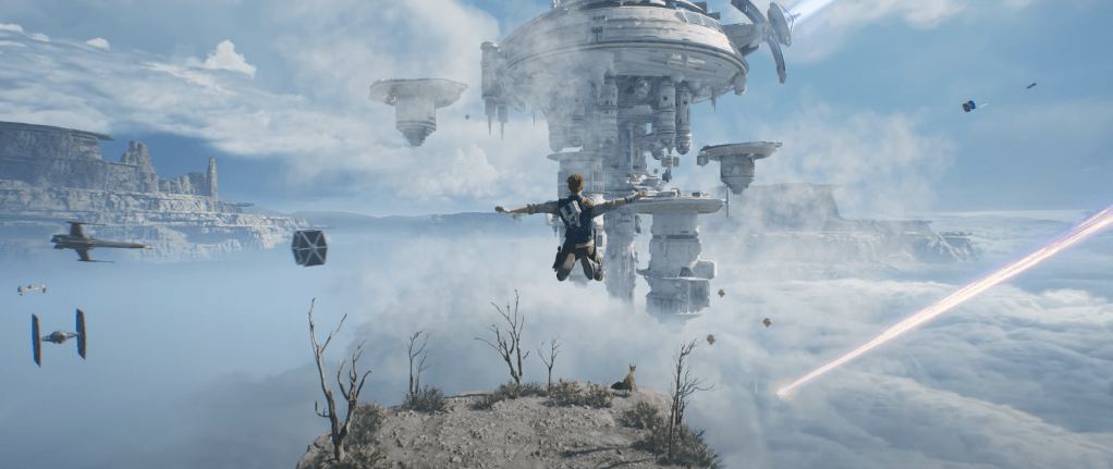 A very minor detail that’s very easy to miss comes in a gorgeous shot of Cal grappling through the sky of a planet, toward a platform of sorts. TIE Fighters swarm around, occupied in combat, and there’s the faintest glimpse on the edge of the screen of an X-Wing in action. This game is set years before the Alliance to Restore the Republic (the Rebellion) was officially formed by Mon Mothma, but there are plenty of different rebel cells spread throughout the galaxy. Remember, this game is set during the same time period as the Obi-Wan Kenobi series, which saw another one of those cells. Might Cal run into a different one in this game, and join up with them? Or is he simply undertaking this mission at the same time there’s another conflict happening?