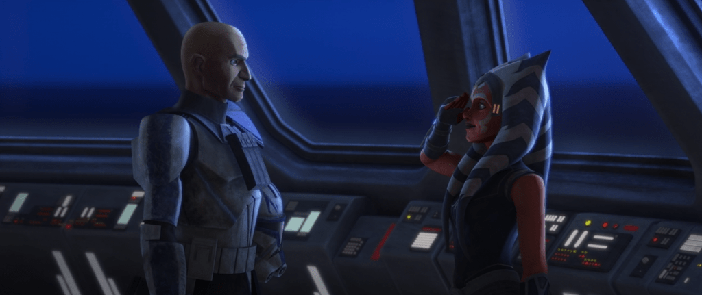 By the time of the Outer Rim Sieges near the end of the War, Tano had left the Jedi Order. But she returned to enlist the help of Skywalker and Kenobi in apprehending the renegade Sith Lord Maul on Mandalore, which could prove pivotal to the Republic’s efforts of getting to the bottom of the mysterious Sith threat. She shared a touching reunion with Anakin, Rex, and the 501st, but her request for Republic aid on Mandalore was stopped by a major crisis: in a stunning move, General Grievous had attacked Coruscant and the Jedi had lost all contact with Chancellor Palpatine, causing Kenobi and Skywalker to rush back to the capital to rescue the captive Chancellor (the beginning of Revenge of the Sith). Before they did so, however, Anakin divided the 501st and placed Rex in command of a section of their forces, and Ahsoka and Rex together led this group into battle in the Siege of Mandalore.