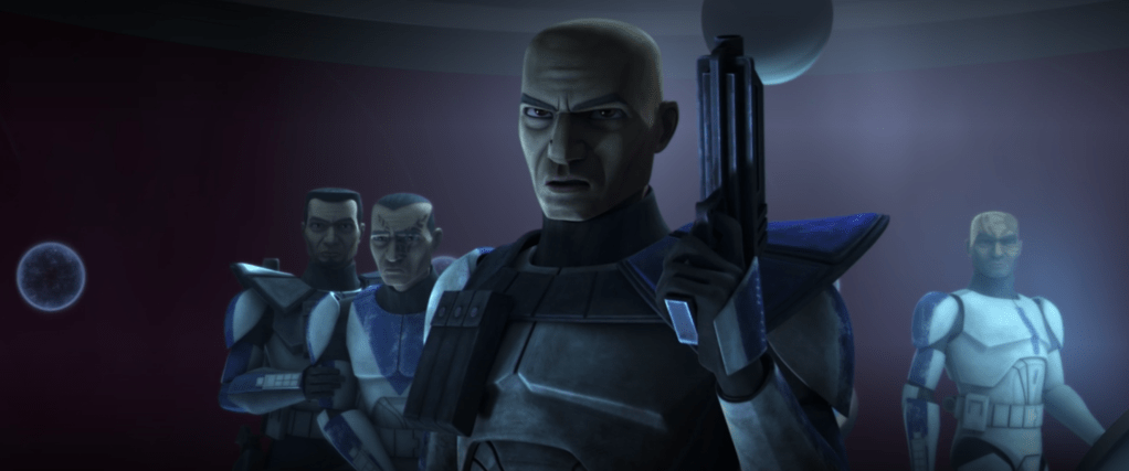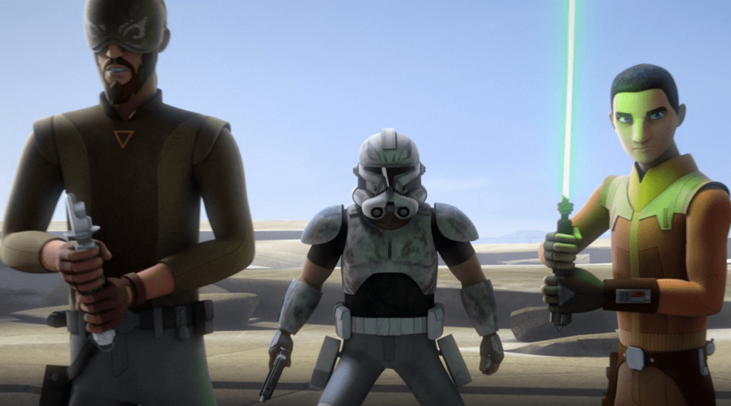 While Ahsoka bested Maul in combat Rex led the 501st to defeat Maul’s army. But while en route to Coruscant with their prisoner, Order 66 happened. Rex resisted the order, pleading with Ahsoka to “Find Fives” before turning on the former Jedi. Ahsoka fended off the clone attack and investigated Fives, a clone who had earlier stumbled upon a conspiracy and was killed for it. She pieced together that there was an inhibitor chip in the head of every clone that enabled this turn, so she enlisted some droids to remove Rex’s chip. Together, Ahsoka and Rex fought off the waves of the 501st still loyal to Order 66, and they escaped.