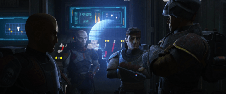 What follows is an infiltration mission where Rampart plays the part of an Imperial officer (complete with a gag about how his stolen uniform isn’t the right rank) and the rest of the squad are his guard (which means all the markings on their armor of individuality must go, and the squad dons all-black gear). Echo sneaks aboard the ship heading for Tantiss, while Hunter flies their shuttle close behind the transport waiting for Echo to disable the proximity sensors. It’s a tense moment all around, as we realize that we don’t actually know what happens to any of these characters. There are moments where it seems like Echo might not make it out, but he comes through at the very end. Rampart keeps insisting to Hunter that they’ll never make it, but Hunter refuses to abort the mission and at just the last moment the shuttle can attach.