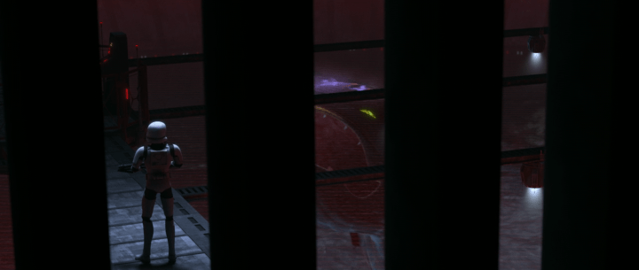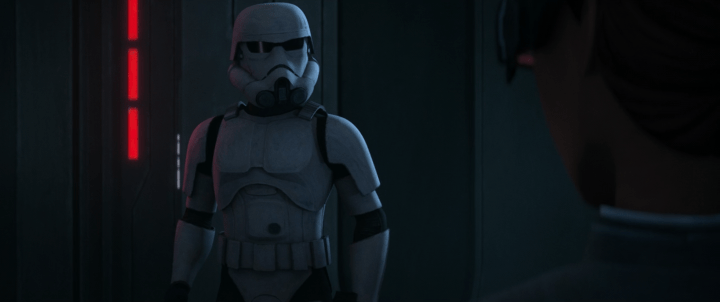 En route to Tantiss, the Bad Batch prepares for what will happen upon arrival, as Echo (aboard the Imperial transport) looks at various files. Echo also, along the way, dons an Imperial stormtrooper uniform and steals a droid hand to fit in, which is a nice disguise. But it’s also a bit ironic to see a clone trooper wearing stormtrooper armor, given everything the Empire has been doing. They’re trying to phase out the clones in favor of the enlisted TK troopers, and Echo is now trying to fit in as one of them.