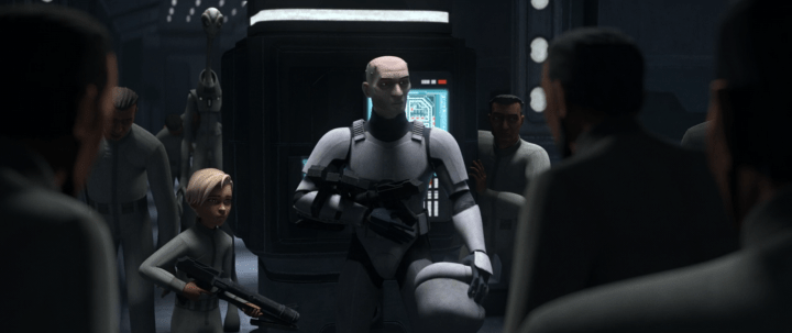 So they free the clones, and as we’d expect, the clones – known for their loyalty – band together to save Hunter, Wrecker, and Crosshair from the clutches of Doctor Hemlock and the CX troopers. It leads to some brutal and harrowing moments, but it’s meant to show us that the clones are stronger together. Loyalty, which Hemlock sees as their weakness, is actually their strength. He tries to control them, but they’ve spent their entire existence in service of others, and they’re fighting for their freedom – the freedom of all clones, everywhere. The CX troopers present a truly daunting challenge, and I’m pretty sure they’re meant to be an initial phase of the Dark Trooper project, both from the look and the music that plays during it being reminiscent of the music from The Mandalorian. It was a bit disappointing to not see Rex or the other regs show up, though, as even though this series wasn’t really about them it’s strange that they were so interested in finding Tantiss and rescuing the clones only to have nothing to do in this finale. I’m not usually one to complain about what we didn’t get, but I do think it’s a missed opportunity not to have Rex’s network playing a bigger role in this event, whatever that might have been.