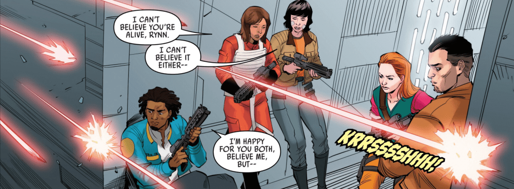 The second issue of the mini-series includes a small strike team being assembled to infiltrate Governor Ubrik Adelhard’s Star Destroyer, trying to break the Imperial’s iron grip of the Anoat Sector. The team is assembled by Rebel High Command, including Leia Organa, and it includes Kes Dameron (the father of Poe), Rynn Zenat, Therisa Alern, and Jarek Yeager.