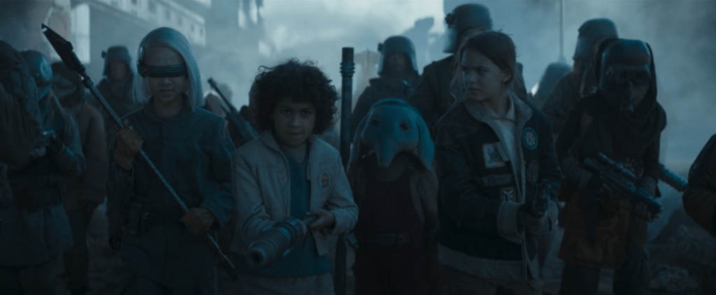 Jod also gets his moments. He’s left behind by the kids on the ship while SM-33 babysits him, which leads to the droid humorously calling Jod “baby” repeatedly. Speaking of humor, Jod’s resigned “you know what, just shoot me” when the enemy soldiers approach was hilarious. The timing and delivery by Jude Law was simply perfect. This show manages to capture a good balance between emotion, humor, and adventure, and I love it. In the end, Jod comes through and rescues the kids. He says he used Wim’s credits to pay off the enemy, but I wonder if there’s more to it. Wim knows it’s stealing, but Jod also says it saved them. They’re both right. But since it all happened off-screen, is there more to it? And what are Jod’s true intentions? This all remains to be seen, but I liked how the kids weren’t immediately just trusting of him after last week. Fern ordered him out of the cockpit, and ordered him to stay on the ship. I’m glad that the kids didn’t just naively trust him after he admitted he wasn’t entirely honest, but I also like how his actions to rescue the kids in this week’s episodes earn him favor. They’re coming to trust him again, and it’s earned. Whether it’s warranted remains to be seen, yet I think we’re already seeing Jod a bit conflicted: he wants the treasure (that’s why he took on this mission in the first place), but he’s not a cruel-hearted pirate with no concern for what happens for these kids.