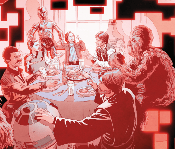 Finally, and most significantly, the issue showed us that Ben had a good childhood. The highlight of this issue was a beautifully-drawn two page spread of glimpses of Ben’s childhood with his family. Vaneé mentions that Anakin’s childhood was a crucible from the earliest age, and then guessed that Ben Solo too walked a path of pain from his earliest days. Ben says, “of course I did”, but this two-page spread betrays his words. It shows us that he actually had a quite wonderful childhood with a family who loved him, and that he didn’t walk the same path as his grandfather. We see Han and Leia, smiling, as a toddler Ben plays with a butterfly-like creature. We see Lando reading Ben a story as his father (dressed like his son) sits happily nearby. We see Ben trying to lift a rock with the Force while Luke looks on approvingly. We see Chewie carrying Ben around on his back, with the young Solo having a wonderful time. We see Ben playing with R2-D2 and C-3PO, as he uses paint to color them. We see Ben sitting in the cockpit of the Millennium Falcon with Han, where father looks to be teaching his son to fly. And we see a joyous meal with the whole family together: Ben, Han, Leia, Chewie, Luke, Lando, and the droids. One happy family.