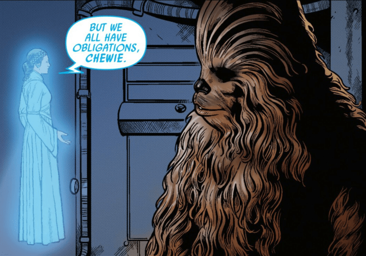 The issue begins with Chewbacca speaking with Leia Organa via hologram. Leia warns Chewie that he can’t get sucked up into Han’s web, or else he’ll turn the Wookiee’s life upside down. Leia tells Chewie to go back to Malla, as “we all have obligations, Chewie. And family has to come first.” It’s at this point that Han walks into the room, and Chewie brushes off the conversation as marriage counseling. Han quickly moves on to the task at hand, of trying to get the Millennium Falcon back, but we shouldn’t move on as fast. For starters, it’s a great moment to get to see Chewie’s relationship with Leia, something that is well-established but hasn’t been actually seen too much in Star Wars stories. But even though Han and Leia are going through some tough times, we see Chewie still communicating with his friend, Leia.