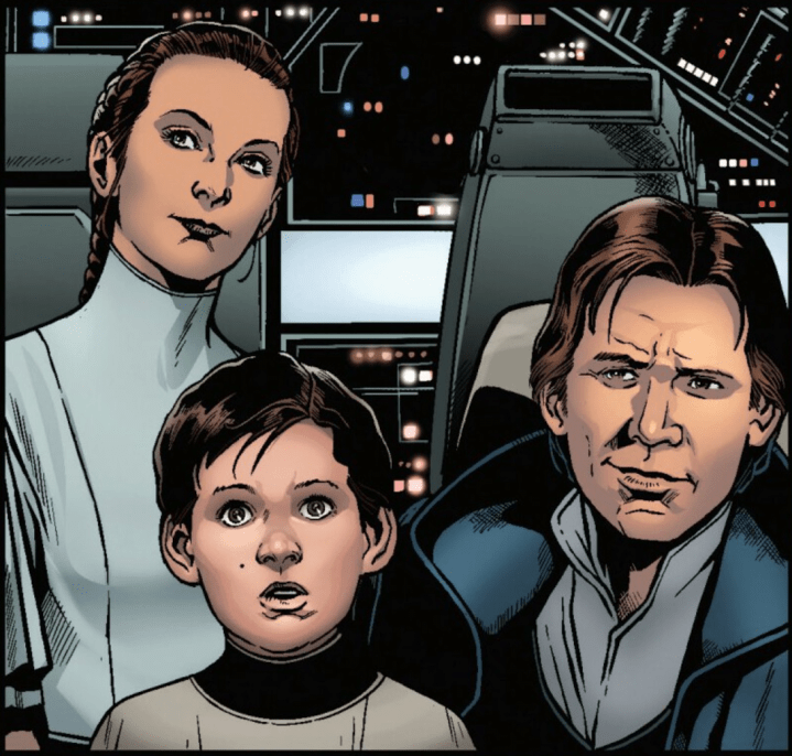 And of course the happy moment highlighted here takes place in the cockpit of the Falcon, because that’s really the point of this whole series. When Han says he wants to get back to the way things were, what he thinks is that getting his ship back will get his life back, and get his happiness back. But what he really wants, without admitting it, is his family. The Falcon became so synonymous with his family, and the core memories he has with them, that he wants the ship back as a way of reclaiming that.