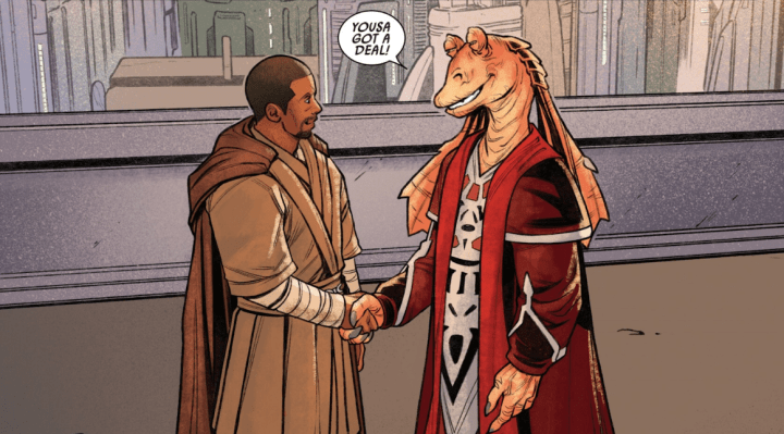 Now, that by itself can be pretty cool, but that’s not the reason why I called it one of the coolest. The reason for that is because the story is about a team-up between Jar Jar and Kelleran Beq – the two characters Ahmed Best has played in the franchise – and the story is written by Best himself, with Marc Guggenheim. It’s pretty cool to see an actor write a story all about the two characters you’ve played on-screen in Star Wars working together. What a fun idea!